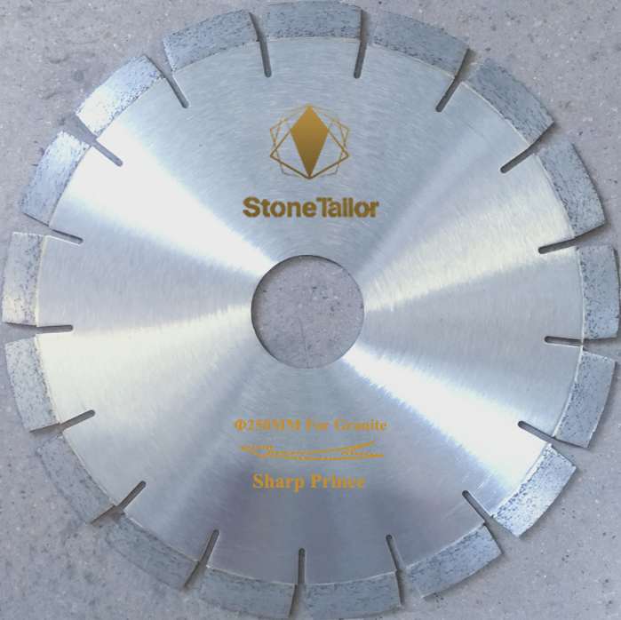 Sharp Prince: SH48A plus long teeth, cutting conventional granite slabs such as Anhai White, Tiger Skin White, olive green, California curse, etc., super sharp, without collapse, corner ,tail, scar phenomenon, the cutting line with straight smooth is of high performance, the verticality and squareness and diagonal error≤0.5mm cutting gap≤4.1mm the max cutting speed is over 8m/min with net, without net it can reach over 7m/min. the working life can be over 150 m2 with cutting the slab plate (thickness:2.5mm-3.0mm).